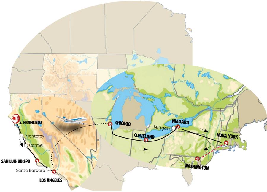 San Francisco SFO, Monterey, Carmel, San Luis Obispo, Santa Barbara, Los Angeles, Chicago, Cleveland, Cataratas do Niagara, Corning, Nova Iorque, Philadelphia, Washington.