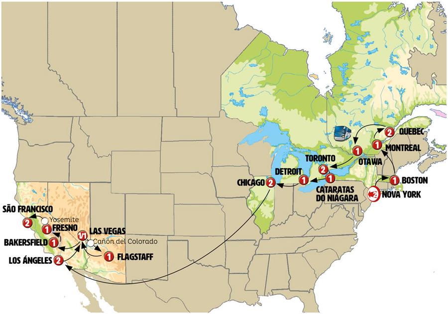 Nova Iorque, Boston, Woodstock, Montreal, Quebec, Sainte-Agathe-des-Monts, Mont Tremblant , Ottawa, Mil Ilhas, Toronto, niagara on the lake, Cataratas do Niagara, Detroit, saugatuck, Chicago, Los Angeles, Las Vegas, cañon del colorado, Flagstaff, Vale da Morte, Bakersfield, Parque Nacional da Sequoia, Fresno, Yosemite, San Francisco SFO.