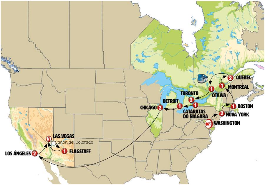 Washington, lancaster usa, Nova Iorque, Boston, Woodstock, Montreal, Quebec, Sainte-Agathe-des-Monts, Mont Tremblant , Ottawa, Mil Ilhas, Toronto, niagara on the lake, Cataratas do Niagara, Detroit, saugatuck, Chicago, Los Angeles, Las Vegas, cañon del colorado, Flagstaff.