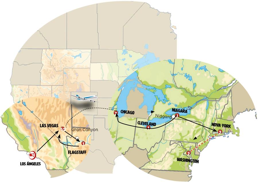 Los Angeles, Las Vegas, cañon del colorado, Flagstaff, Chicago, Cleveland, Cataratas do Niagara, Corning, Nova Iorque.