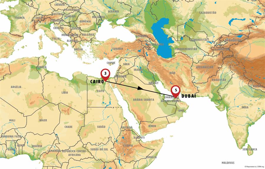 Café da manhã no hotel. Na hora prevista, traslado ao aeroporto do Cairo para embarcar em voo (não incluído) para Dubai. Chegada a Dubai e hospedagem no hotel