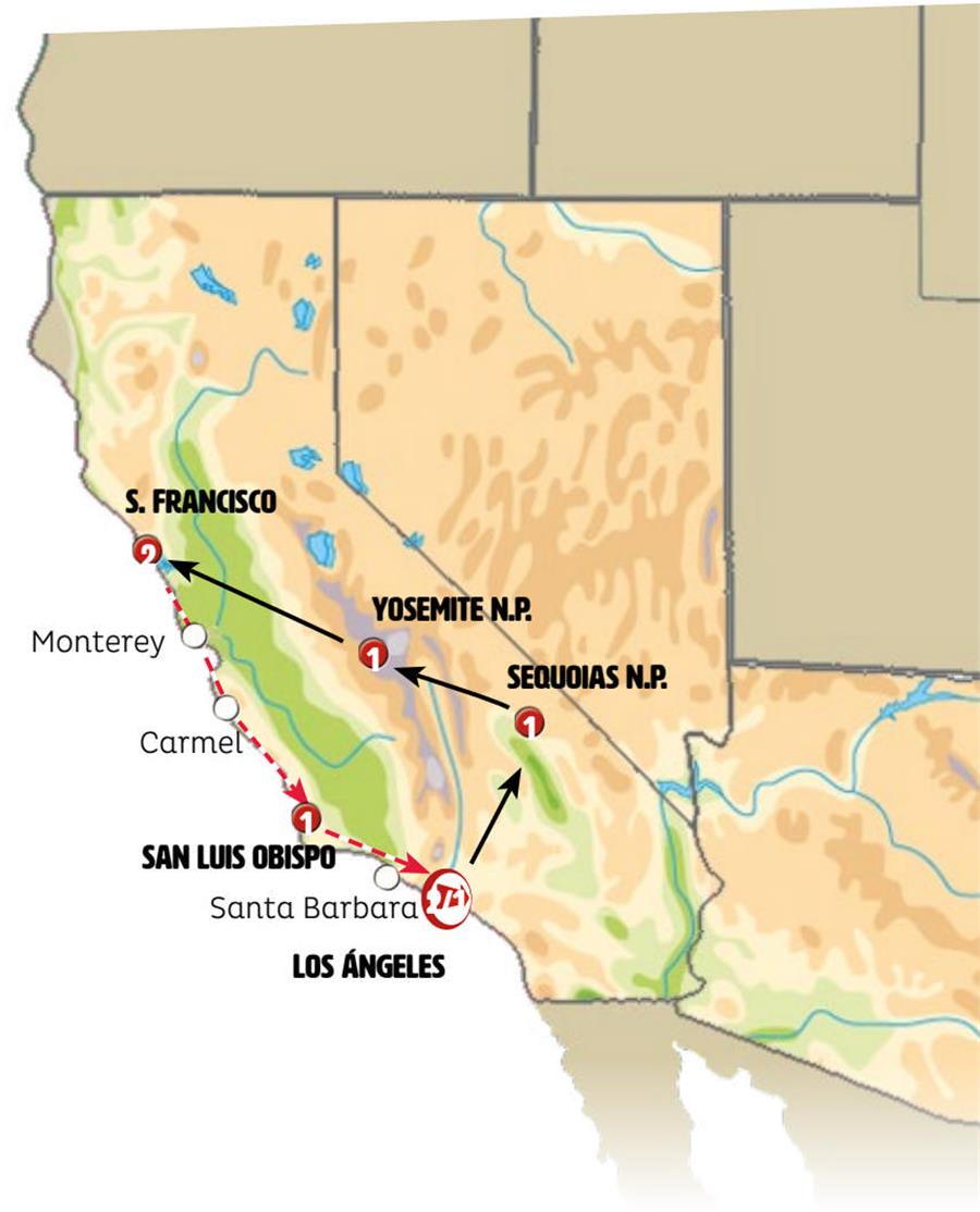 Los Angeles, Santa Monica, Solvang, Bakersfield, Parque Nacional da Sequoia, Fresno, Yosemite, San Francisco SFO.