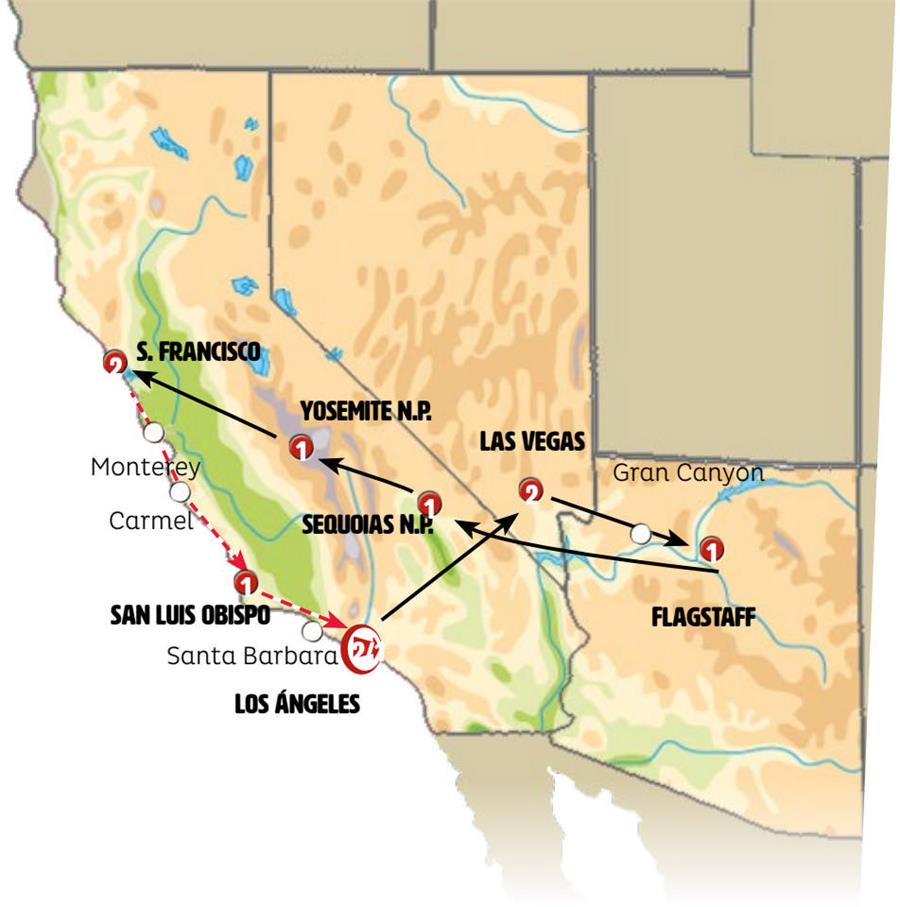 Los Angeles, Las Vegas, cañon del colorado, Flagstaff, Vale da Morte, Bakersfield, Parque Nacional da Sequoia, Fresno, Yosemite, San Francisco SFO, Monterey, Carmel, San Luis Obispo, Santa Barbara.