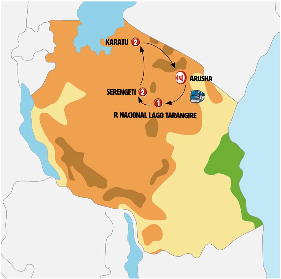 Arusha, p. nacional lago tarangire, Serengeti, karatu, p. nacional lago manyara.
