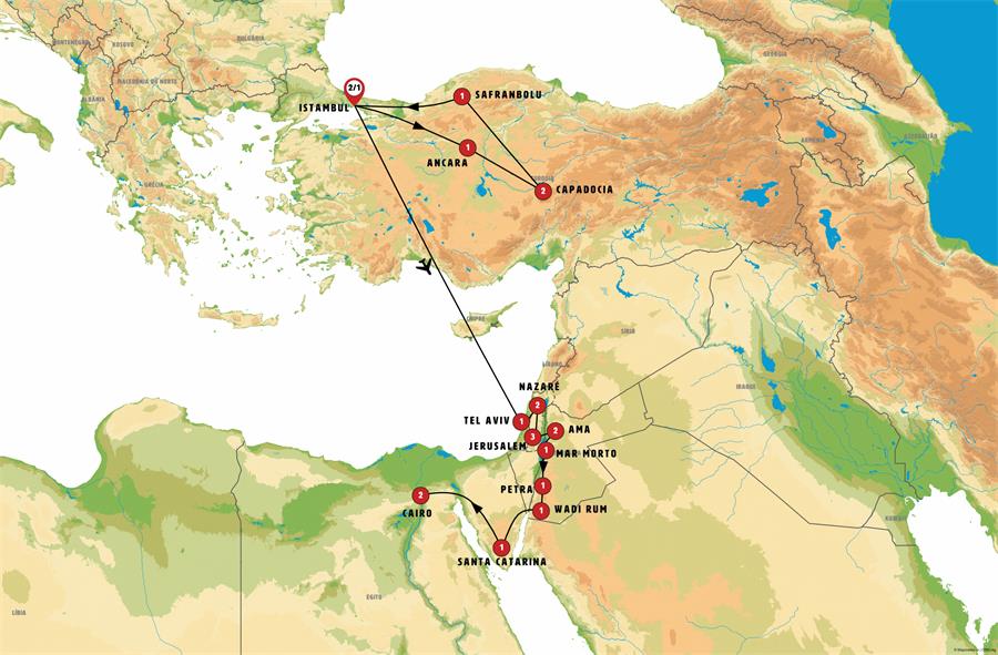 Istambul, Ankara, Capadócia, Safranbolu, gokgol magarasi , eregli, Tel Aviv, Cesarea, Haifa, San Juan de Acre, Nazaré, monte del precipicio, cana de galilea, Rio Jordan, desierto de judea, jerusalen, puente sheik hussein, Jerash, Amã, Madaba, betania, Mar Morto, shobak, Petra, Wadi Rum, Aqaba, Eilat, santa catalina, pozo de moises, Cairo.