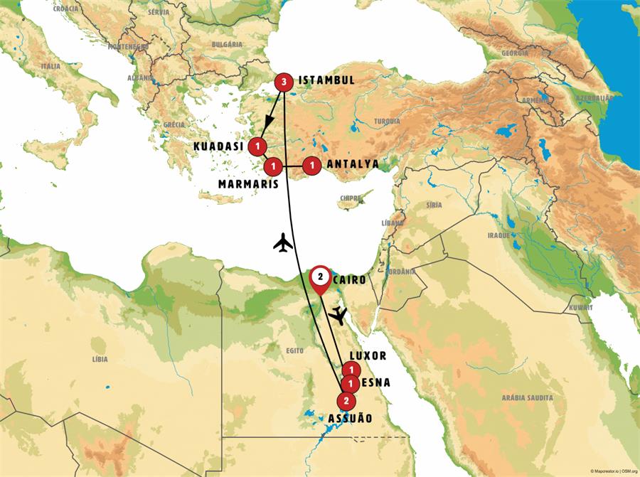 Cairo, Luxor, Esna, Edfu, Kom Ombo, Aswan, Istambul, Éfeso, Kusadasi, Bodrum, Marmaris, Dalyan, Antalya.