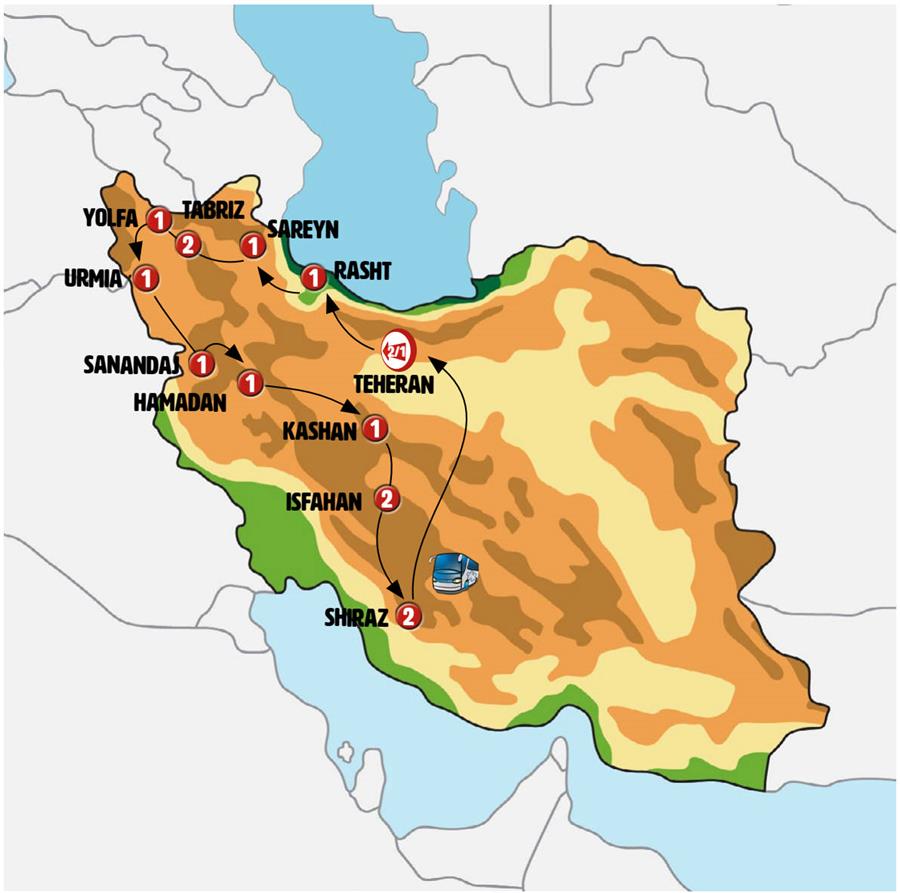 teheran, qazvin, rasht, bandar-e anzali, puente de cristal, sareyn, ardebil, Tabriz, yolfa, khoy, urmia, teppe hasanlu, cueva shaolan, sanandaj, hamadan, Qom, kashan, noushabad ciudad subterranea, caravanaserail abouzeid, abyaneh, Isfahan, izadkhast, qalat, SHIRAZ.
