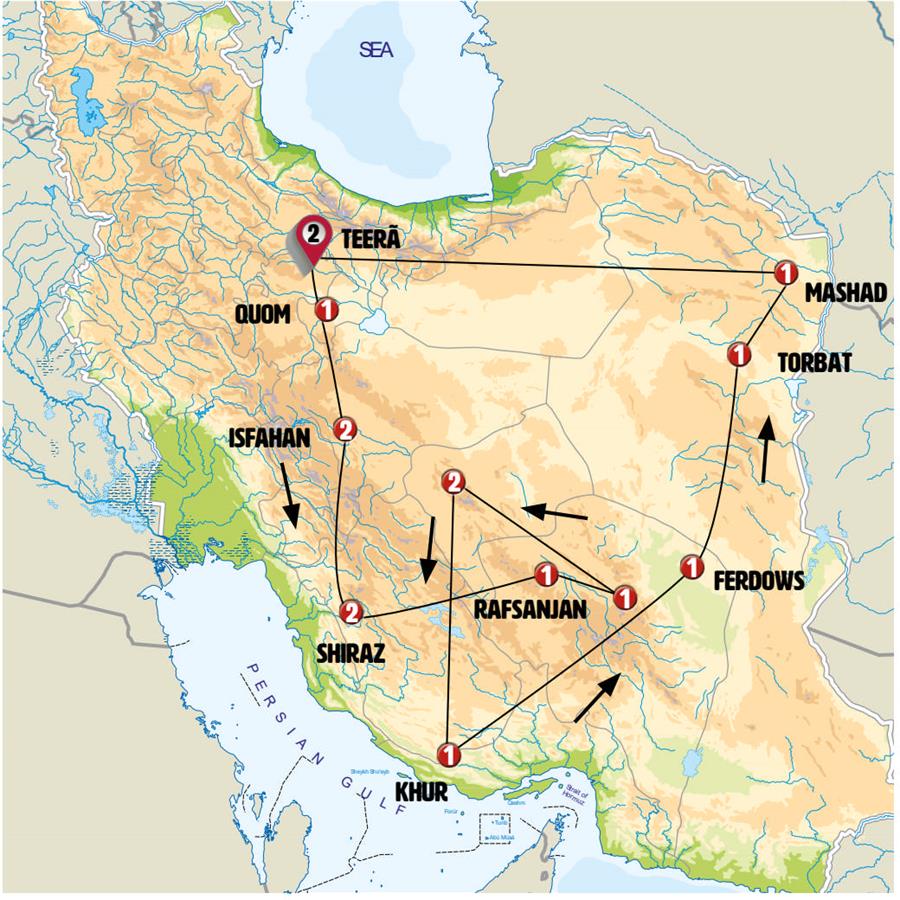 teheran, mausoleo del ayatola jomeini, Qom, kashan, noushabad ciudad subterranea, caravanaserail abouzeid, abyaneh, Isfahan, izadkhast, qalat, SHIRAZ, pasargada, meymand, rafsanjan, mahan, Kerman, zein o din caravanserai, saryazd, Yazd, chak chak, kharang, garmeh, khur, tabas, esfahak, ferdows, gonabad, torbat e jam, Mashhad, nishapur, zafaraniyeh, sabzevar, jangale abr, damghan, garmsar.