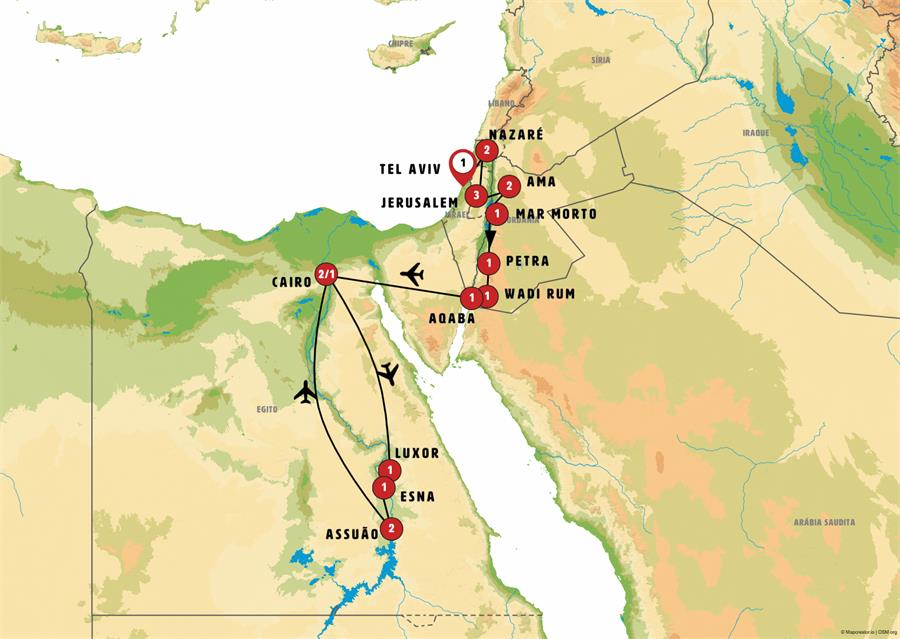 Tel Aviv, Cesarea, Haifa, San Juan de Acre, Nazaré, monte del precipicio, cana de galilea, Rio Jordan, desierto de judea, jerusalen, puente sheik hussein, Jerash, Amã, Madaba, betania, Mar Morto, shobak, Petra, Wadi Rum, Aqaba, Cairo, Luxor, Esna, Edfu, Kom Ombo, Aswan.