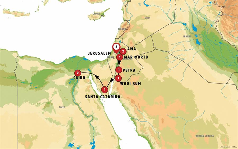 jerusalen, puente sheik hussein, Jerash, Amã, Madaba, betania, Mar Morto, shobak, Petra, Wadi Rum, Aqaba, Eilat, santa catalina, pozo de moises, Cairo.