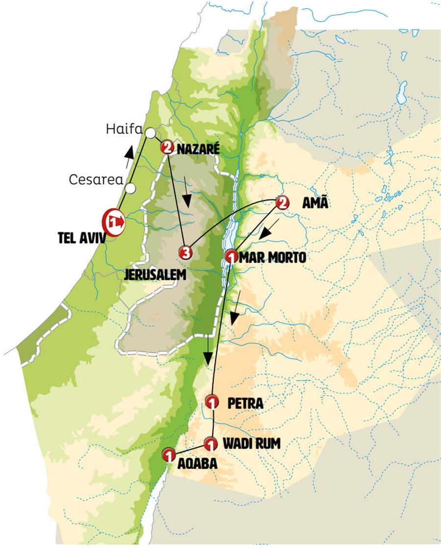 Amã, Jerash, Madaba, betania, Mar Morto, shobak, Petra, Wadi Rum, Aqaba.
