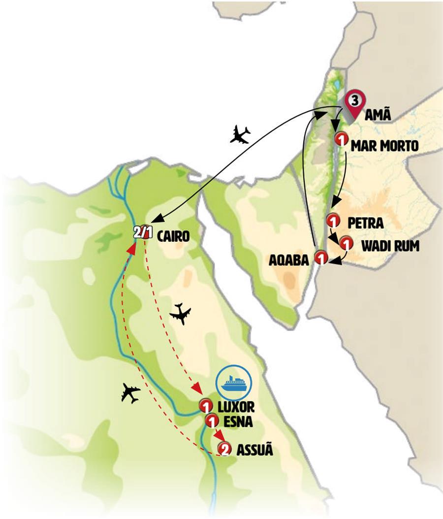 Amã, Jerash, Madaba, betania, Mar Morto, shobak, Petra, Wadi Rum, Aqaba, Cairo.