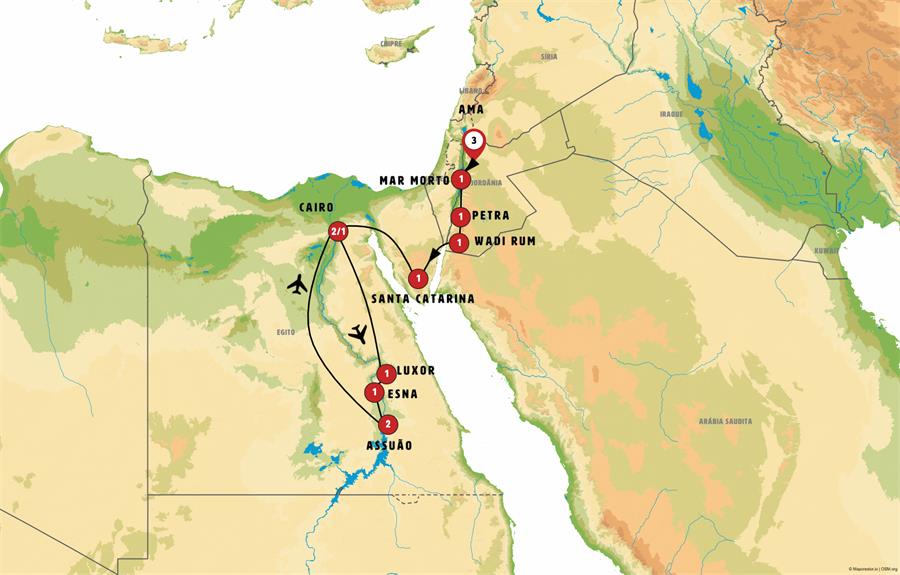 Amã, Jerash, Madaba, betania, Mar Morto, shobak, Petra, Wadi Rum, Aqaba, Eilat, santa catalina, pozo de moises, Cairo, Luxor, Esna, Edfu, Kom Ombo, Aswan.