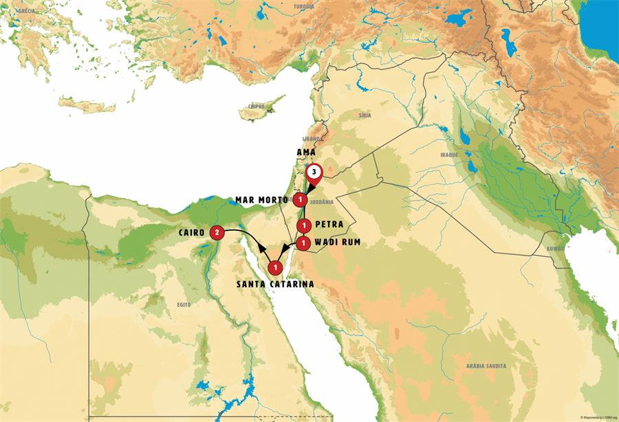 Amã, Jerash, Madaba, betania, Mar Morto, shobak, Petra, Wadi Rum, Aqaba, Eilat, santa catalina, pozo de moises, Cairo.