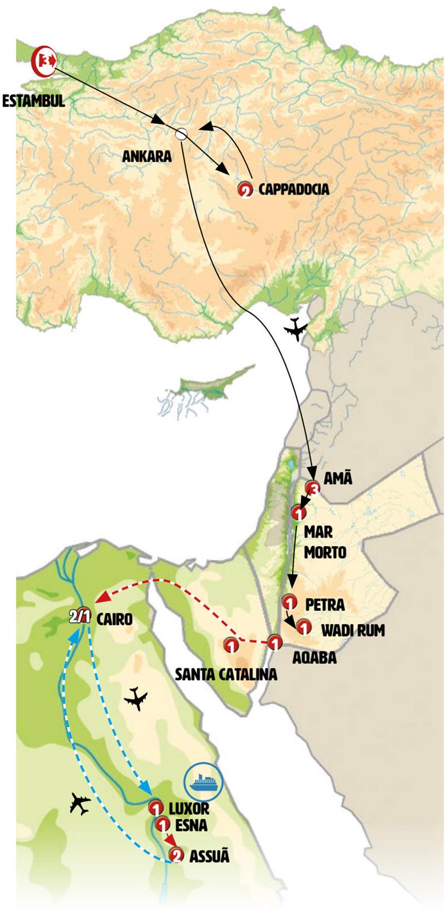 Istambul, Ankara, Capadócia, Amã, Jerash, Madaba, betania, Mar Morto, shobak, Petra, Wadi Rum, Aqaba.