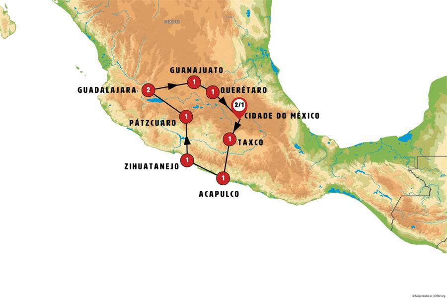 Cidade do México, tepoztlan, Cuernavaca, Taxco, Acapulco, Zihuatanejo, Janitzio, Pátzcuaro, Morelia, Tlaquepaque, Guadalajara, Guanajuato, Dolores Hidalgo, San Miguel de Allende, Queretaro, Tula, Puebla.