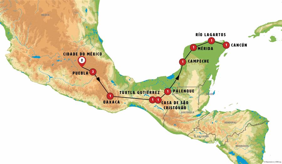 Cidade do México, Puebla, Oaxaca, san pablo villa de mitla , Tuxtla Gutiérrez, Canon del Sumidero, chiapa del corzo, Zinacantan, San Juan Chamula, San Cristobal de Las Casas, Agua Azul, Misol Ha, Palenque, Campeche, merida mx, izamal, Chichen Itza, rio lagartos, cenote choj ha, Cancun.