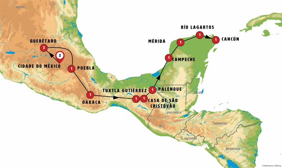 Cidade do México, Queretaro, Tula, Puebla, Oaxaca, san pablo villa de mitla , Tuxtla Gutiérrez, Canon del Sumidero, chiapa del corzo, Zinacantan, San Juan Chamula, San Cristobal de Las Casas, Agua Azul, Misol Ha, Palenque, Campeche, merida mx, izamal, Chichen Itza, rio lagartos, cenote choj ha, Cancun.