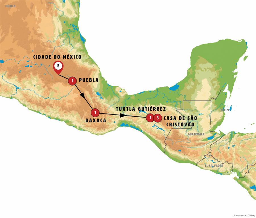 Conheceremos o CÂNION DO SUMIDERO, navegaremos de lancha por este impressionante cânion de quase 1 km de profundidade e 14 km de comprimento. Em seguida faremos um passeio por CHIAPA DEL CORZO, lugar colonial de tradição e cultura. Após, nos adentraremos na cultura maia, conheceremos belos vilarejos habitados pelos índios Tzotziles. Em ZINACANTAN poderemos admirar os vestidos que usam suas mulheres, assim como suas lojas-oficinas de teares. Em SAN JUAN DE CHAMULA nos surpreenderá sua igreja que mistura em seus ritos o cristianismo com as tradições pré-colombianas. Continuaremos rumo a SAN CRISTÓBAL DE LAS CASAS. Tarde livre nesta belíssima cidade colonial fundada em 1528.