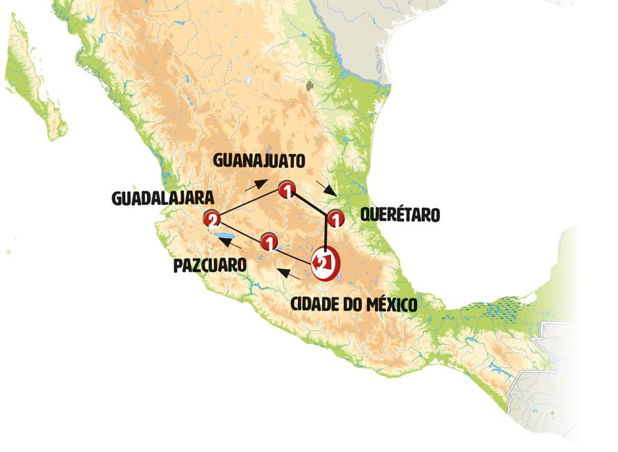 Cidade do México, mina de las dos estrellas, tlalpujahua, Pátzcuaro, Morelia, Tlaquepaque, Guadalajara, Guanajuato, Dolores Hidalgo, San Miguel de Allende, Queretaro, Tula, Puebla.